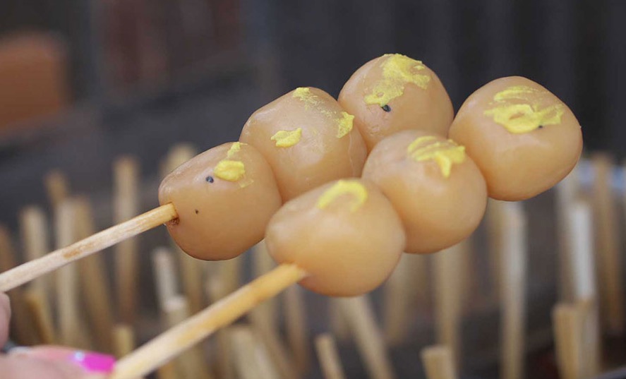山形の観光地定番のファストフード。醤油の香ばしさが染み込んだこんにゃくに、カラシはお好みでどうぞ。