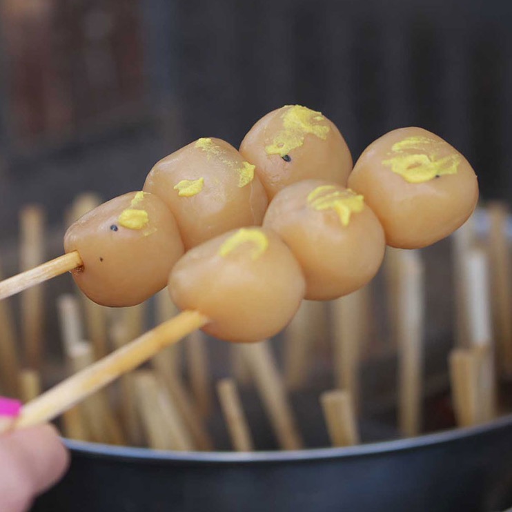 山形の観光地定番のファストフード。醤油の香ばしさが染み込んだこんにゃくに、カラシはお好みでどうぞ。