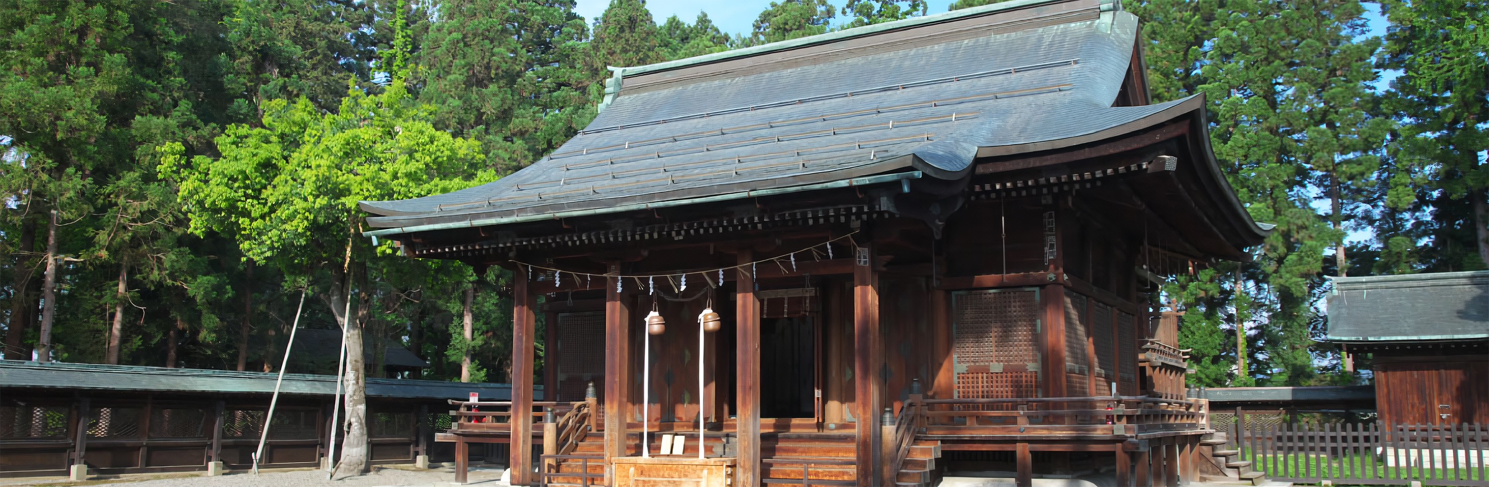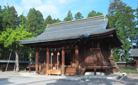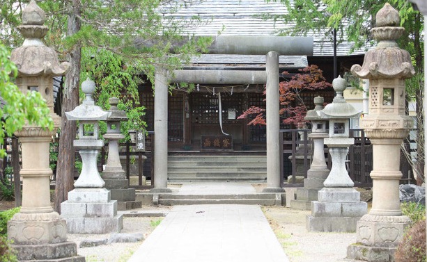 上杉城史苑から奥に入った松岬公園内にあり、上杉謙信公を祀っています。大正8 年の米沢市大火の際、本殿もふくめすべて消失。その後、明治神宮の設計者として知られる、米沢市出身の建築家・伊東忠太博士の設計により、大正12 年に再興しました。