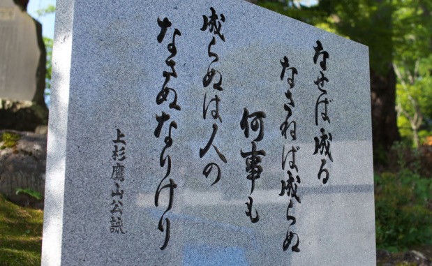 米沢の今を築いた名君・上杉鷹山や景勝、直江兼続などを祀り、鷹山の名言「為せば成る」「伝国の辞」の石碑が建てられています。