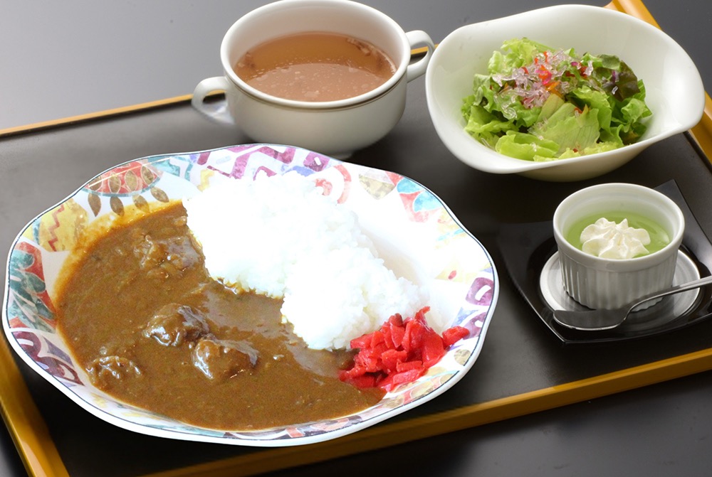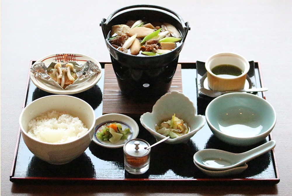 ※牛肉・醤油味の米沢風芋煮。里芋は柔らかく、素材の旨みたっぷり!上杉城史苑自慢の芋煮を、是非お召し上がりください。